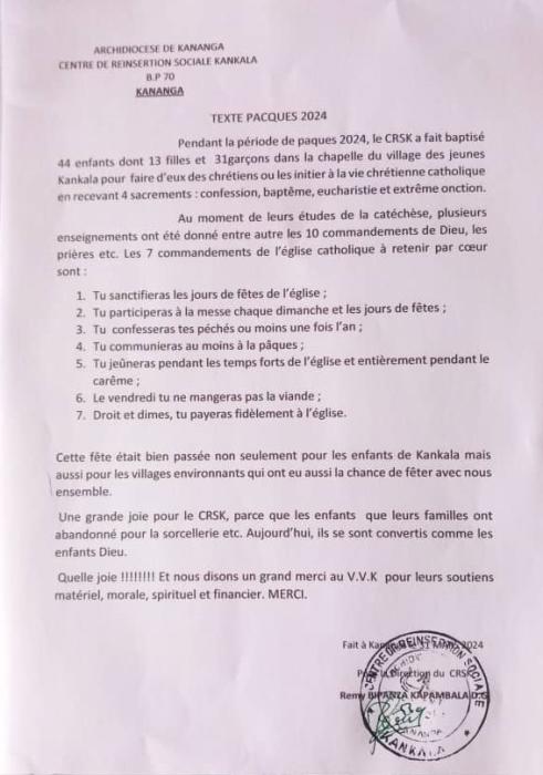Dankzij CRSK konden dertien meisjes en eenendertig jongens in de kapel van het jongerendorp Kankala vier sacramenten ontvangen: de biecht, het doopsel, eerste communie en vormsel. Het was een grote vreugde voor die kinderen, waarvan velen buitengesloten waren door hun familie, maar nu bij een nieuwe grote familie opgenomen werden. Zij zijn nu kinderen van God en dit mocht gevierd worden.